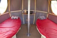 The insulation is hi-tech too, a thick layer of modern, breathable insulating material mixed with re-cycled clothing, all woven together by expert quilt-makers in Lancashire. With this ultramodern fabric and a shiny steel central pole to which the wooden shell and outer wrap is attached, it all looks very futuristic, as if NASA have taken up designing tents. Cocooned inside with the windows shut, you might imagine you’re floating high above the earth in a space station, rather than just a few metres off the ground.